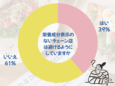 この結果から、約4割の人が栄養成分表示のないチェーン店を避けているのに対し、約6割の人は特に気にしていないことがわかります。